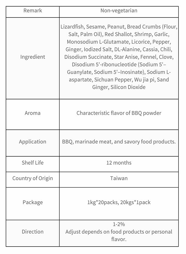 Authentic Taiwan BBQ flavor provide distinct and aromatic taste on all kinds of foods.
