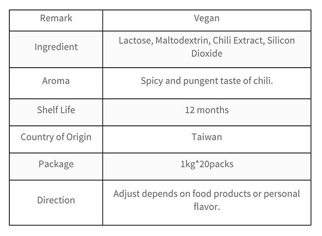 Chili essential powder is extracted from fresh chili and full of aroma and taste of chili. It is widely used to heighten the chili flavor in all kinds of food products.