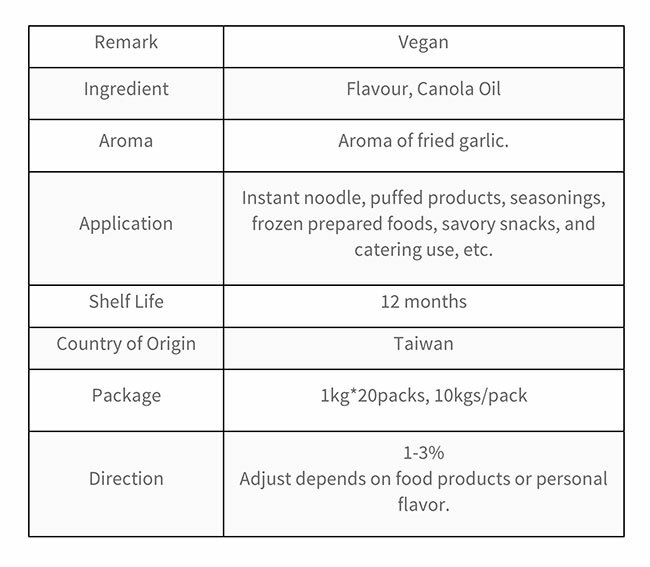Garlic flavor oil is infused the vibrant flavor of the freshest and select garlic. Perfect for drizzling into cold-cut, stir-fried, seasonings, and noodles to up the aroma and taste.