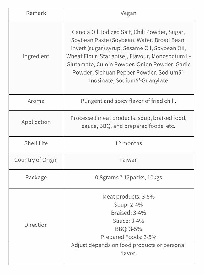 Bring extra pungent and spicy taste from select chili peppers to all culinary. It is flavorful basis for stock, soup, dips, roasted foods and braised dishes.