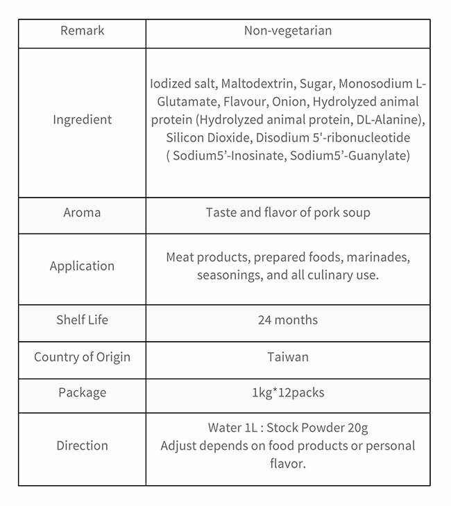 Stock powders are dried powder with origin and fresh taste of pork and onion used to be a quick replacement for bouillon. Also perfect seasoning for stir-fried dishes.
