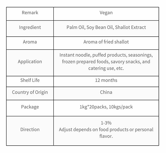 Shallot flavor oil is infused the vibrant flavor of the freshest and select shallot. Perfect for drizzling into cold-cut, stir-fried, seasonings, and noodles to up the aroma and taste.