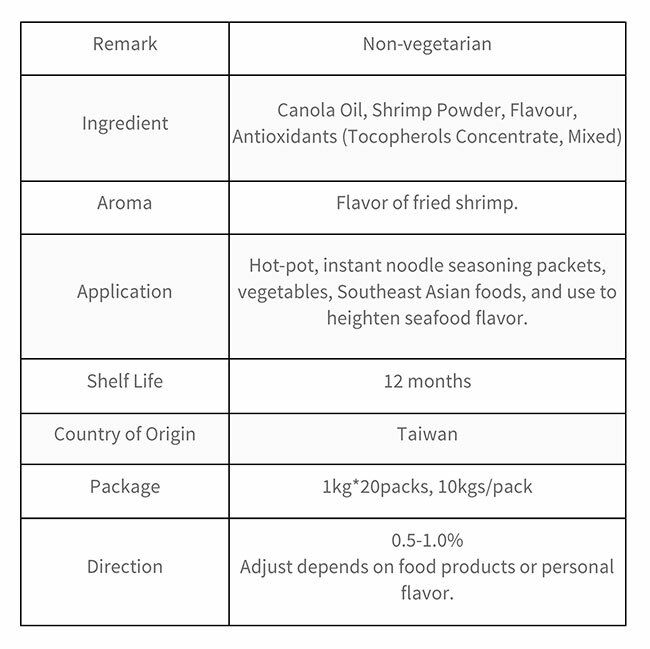 Shrimp flavor oil is infused the vibrant flavor of shrimp. Perfect for drizzling into cold-cut, stir-fried, seasonings, and noodles to up the aroma and taste.