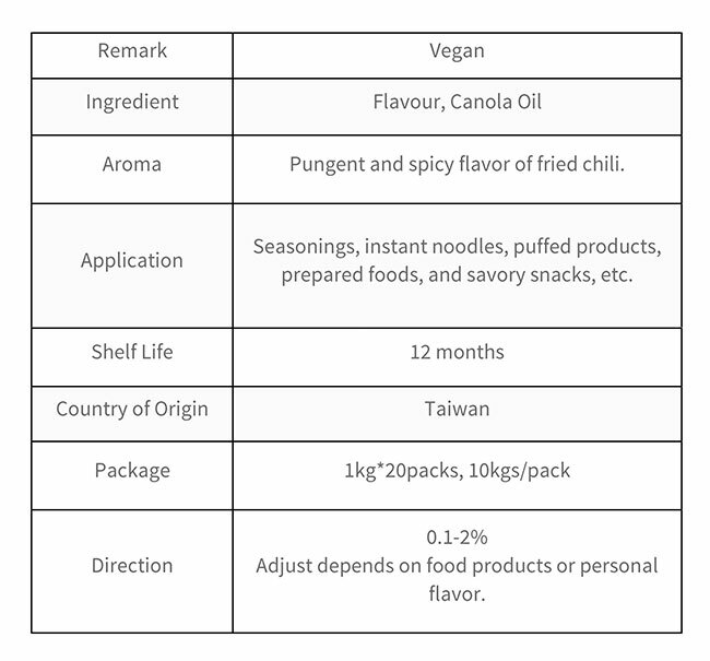 Spicy flavor oil is infused the vibrant flavor of the freshest and select chili. Perfect for drizzling into cold-cut, stir-fried, seasonings, and noodles to up the aroma and taste.