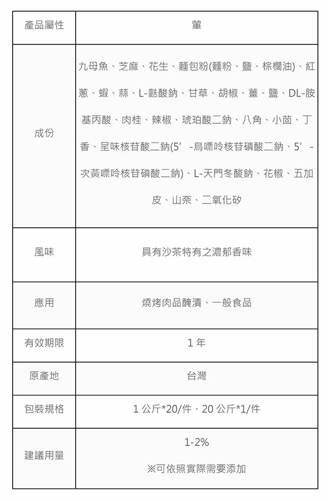 沙茶粉為精心調配而成之複合調味料,富涵豐富之口感,適合應用於各式食品之調配,可賦予產品豐滿、特殊之香味。