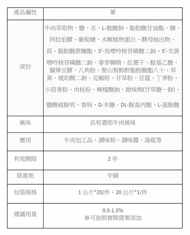 本產品經梅納反應精製調配而成,具有濃郁牛肉香氣和純厚口味,可應用於各類食品增香調味。