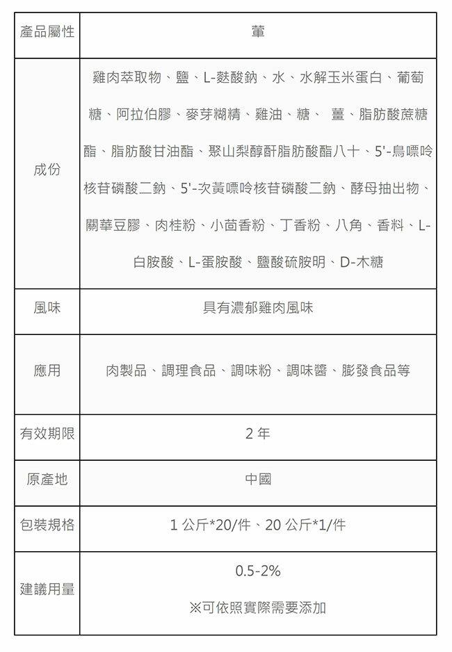 本產品經梅納反應精製調配而成,具有濃郁雞肉香氣和純厚口味,可應用於各類食品增香調味。