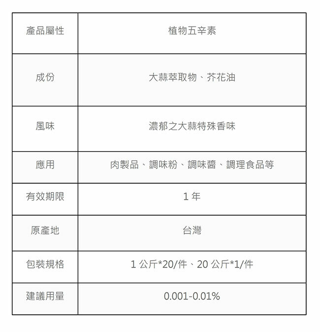 本產品嚴選大蒜蒸餾調製而成,蒜香濃郁,可替代蒜粉提供蒜香。