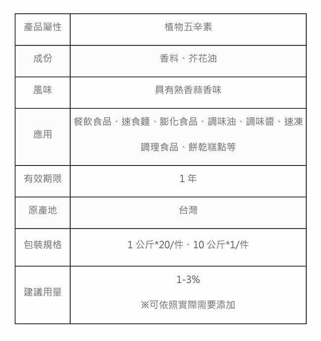 本產品採用大蒜萃取物與食用植物油經過熱反應製成,具有大蒜熟化後特有的香氣和口味,應用於各種食品增香、調味。