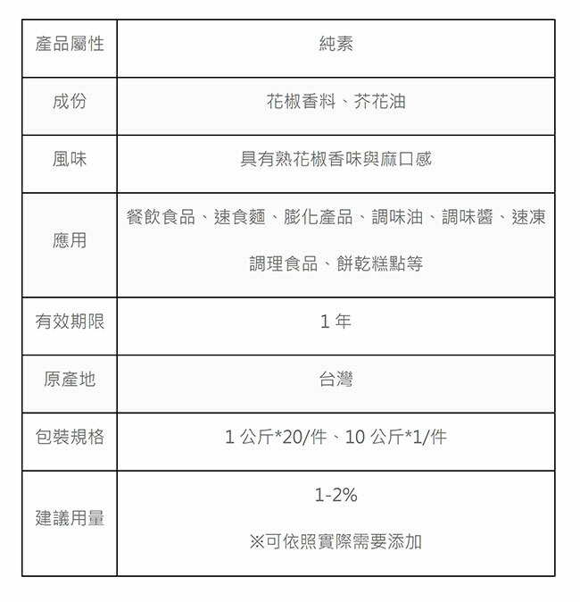 本產品採用新鮮優質的花椒,經植物油高溫煉萃調製,具有花椒爆香特有的風味。