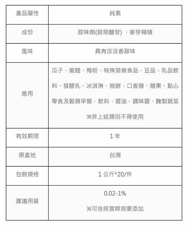 為甜味近似蔗糖之甜味劑,其高甜度之特性(約為蔗糖之 125 倍),為甜味替代性佳之產品。